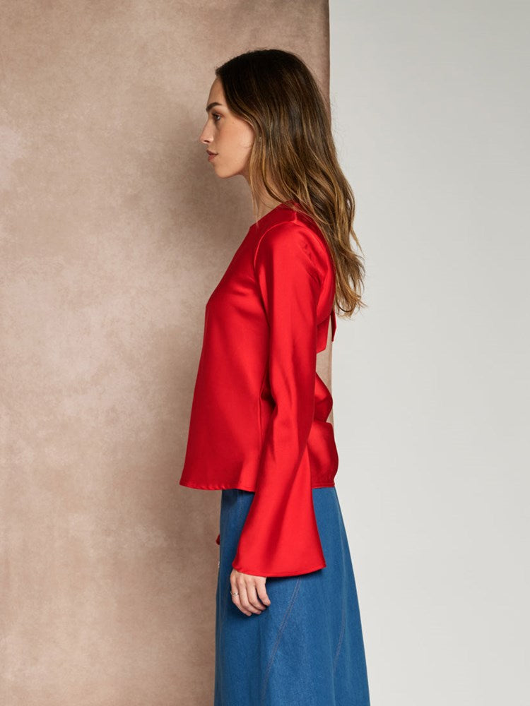 Top in a satin fabric. Featuring a statement draped back and tie to fasten.