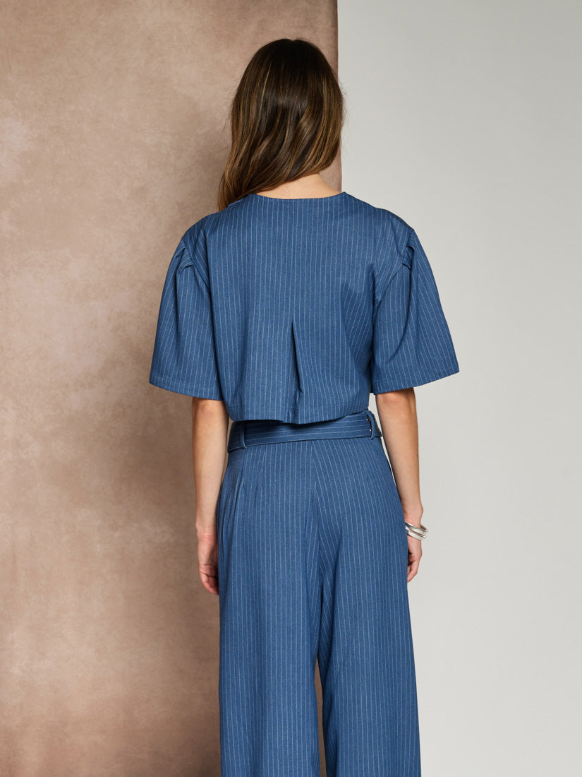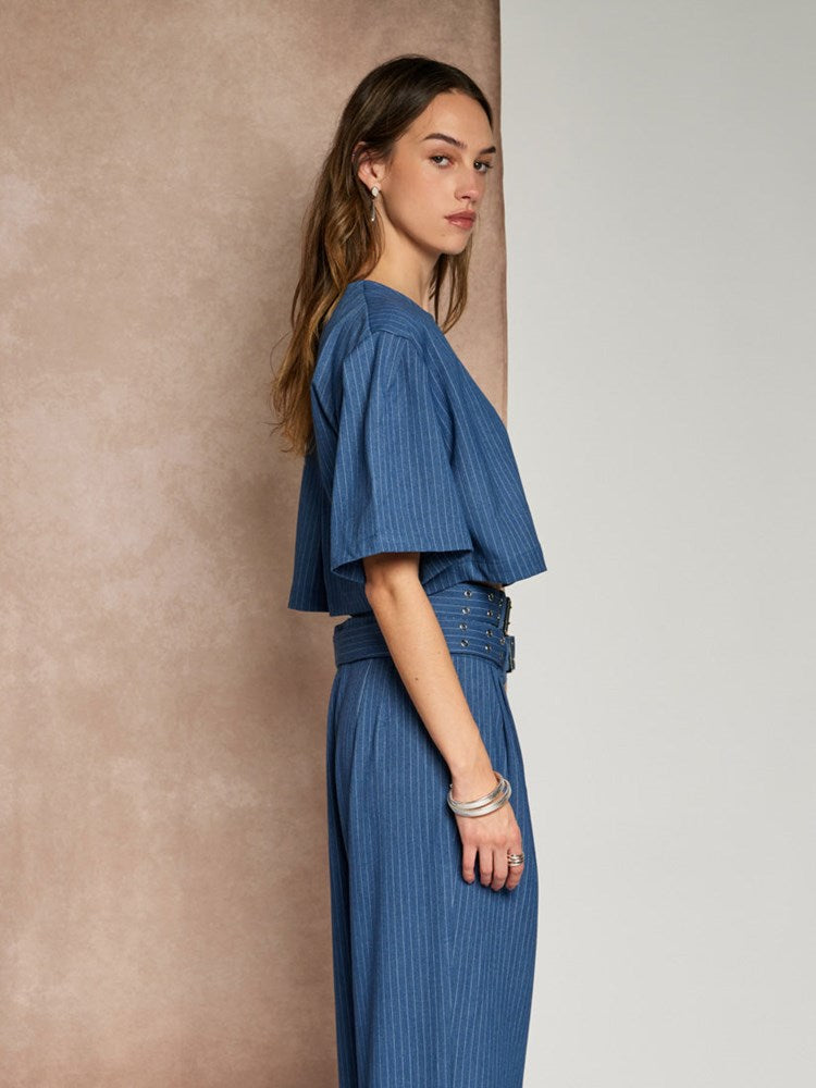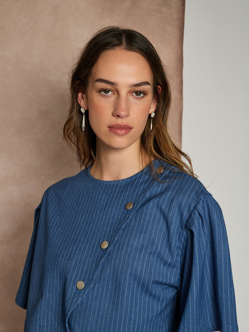 The Bettie Top is sharp and confident, with a wrap shape that folds naturally into an asymmetric opening. Metal buttons add a utilitarian edge, grounding the pinstripe fabric in modernity. It’s polished, but in an understated, cool way.