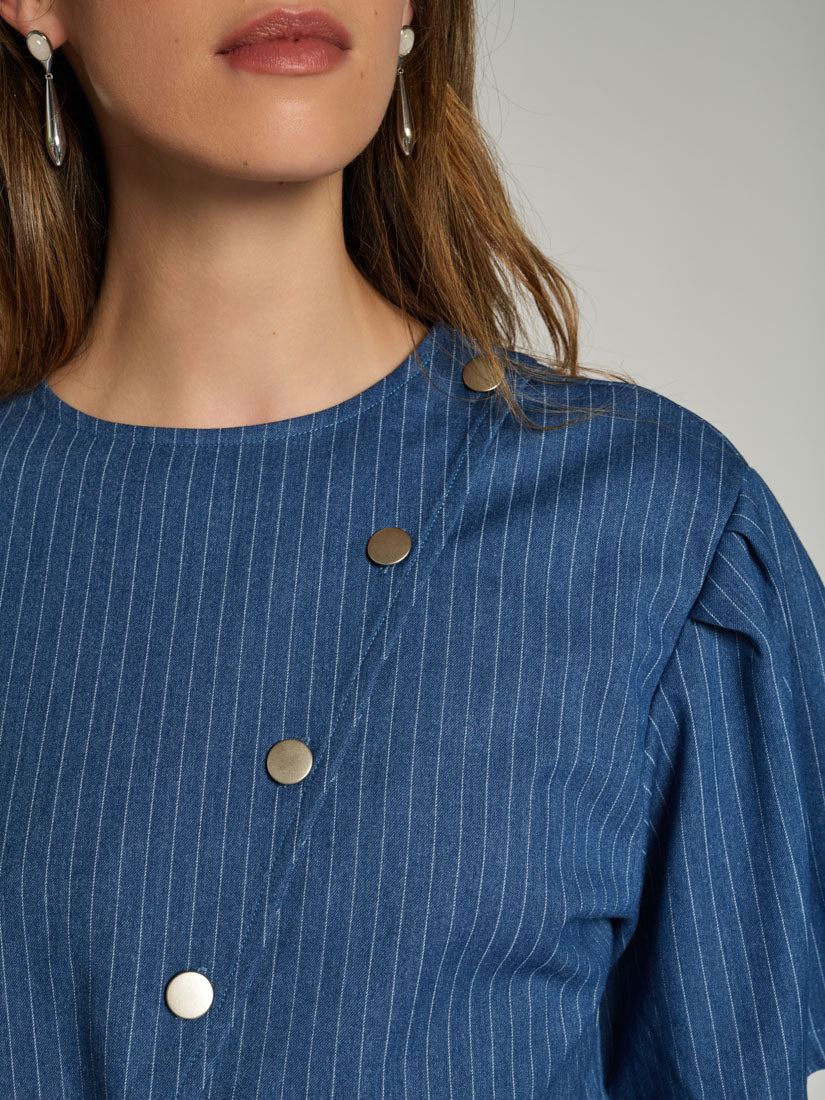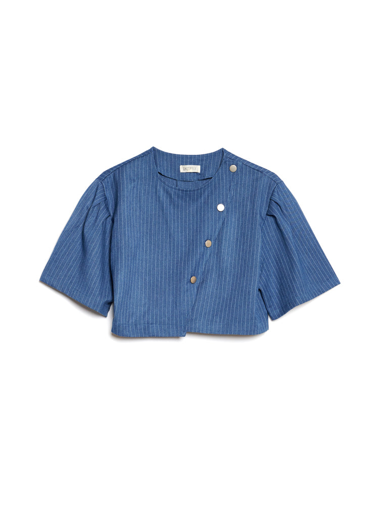 Wrap top in a pinstripe fabric. A boxy fit featuring an asymmetric opening fastened with metal buttons.