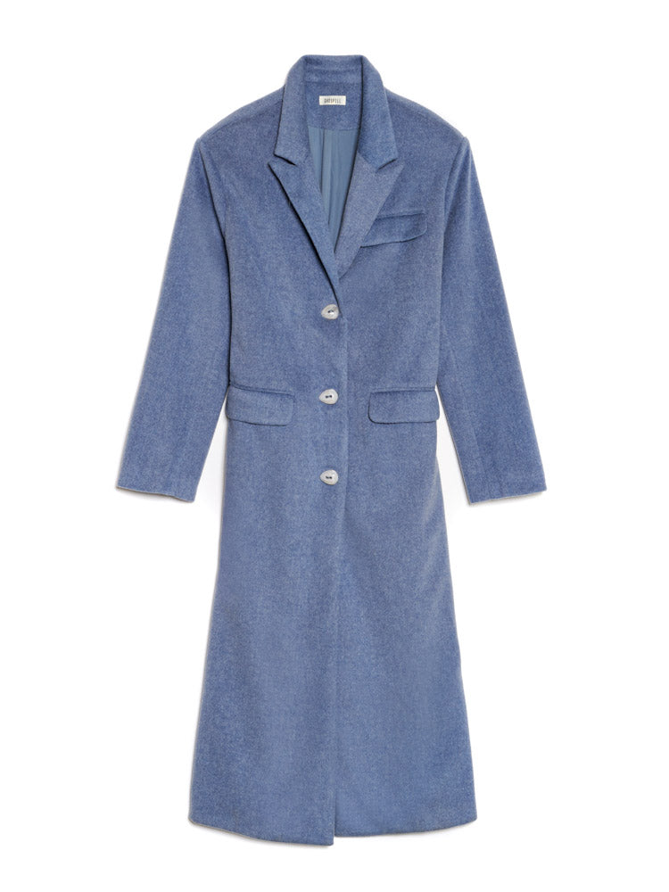 Longline blazer coat in a soft felt. A boxy fit featuring a trio of pocket flaps and a waist belt. Fully lined and fastened with chunky irregular buttons.
