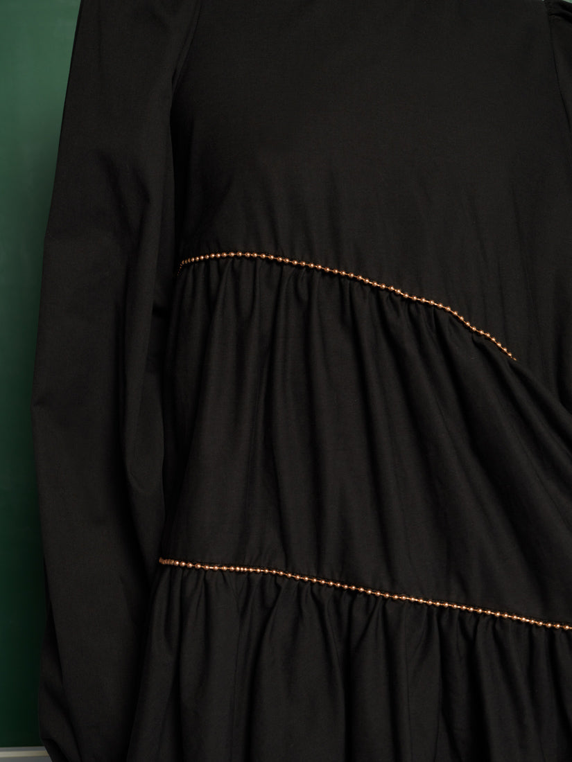 Mini dress in a woven fabric. An oversized style featuring asymmetric curved gathered seams and a gold bead trim. Fastened with a button at the back neck. The length of the dress is 88.5-92.5 cm depending on the size.