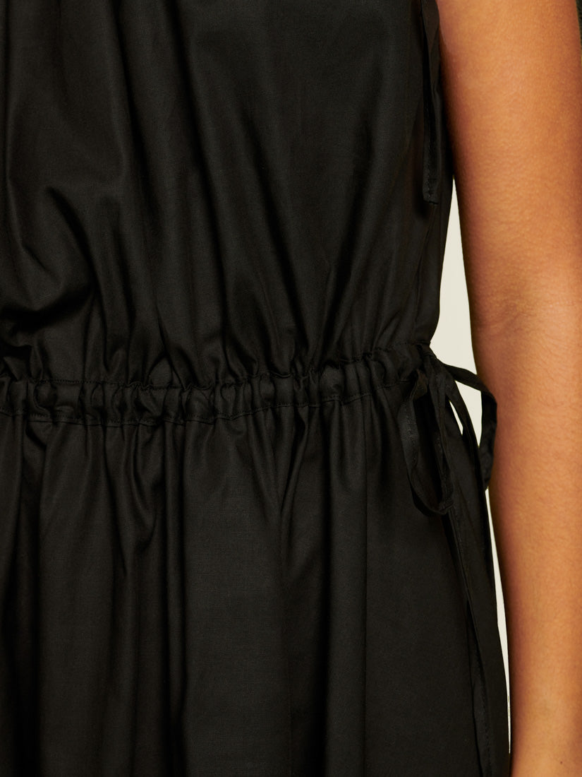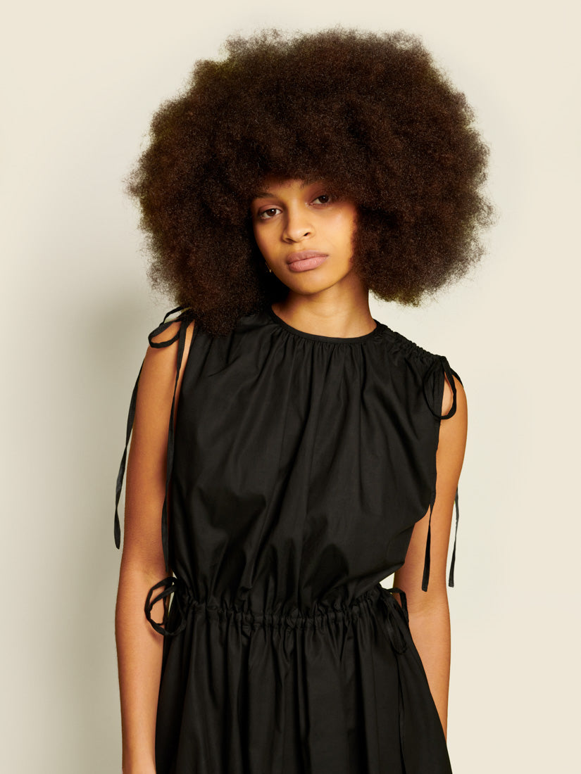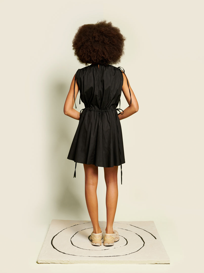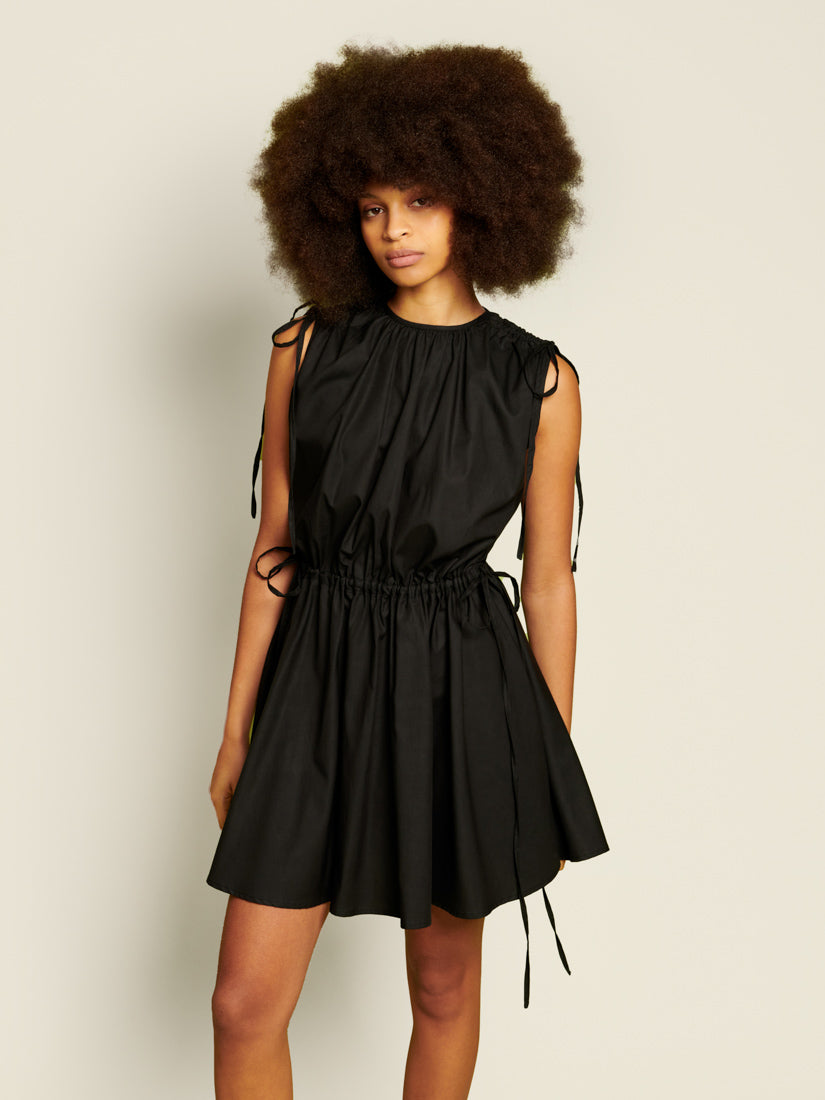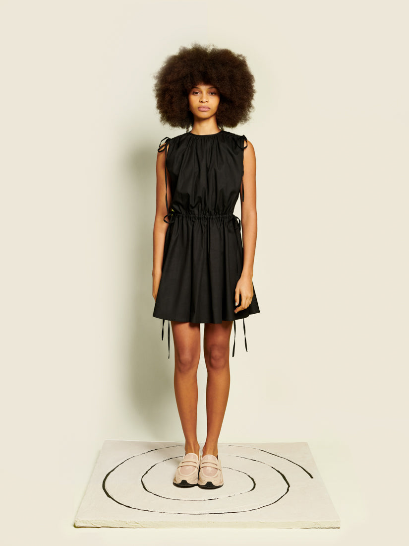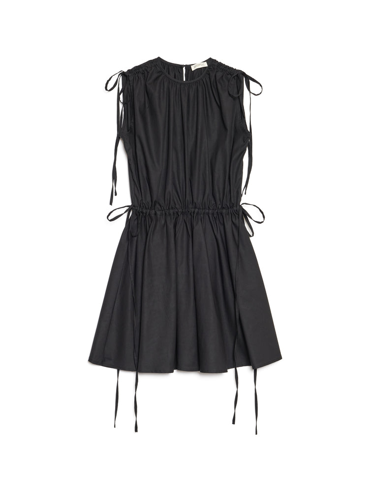 Mini dress in a cotton feel woven fabric. A sleeveless style featuring shoulder and waist ruching with adjustable extra-long ties. The length of the dress is 86-90 cm depending on the size.