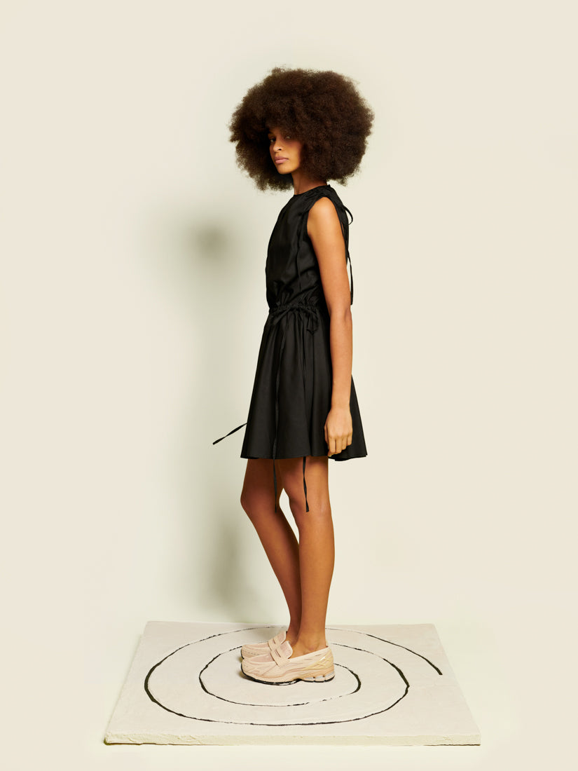 The Gilia Drawstring Mini Dress gathers and releases through shoulder and waist ties that fall long and free. It’s a piece that invites movement. Its adjustable, expressive, and full of light.