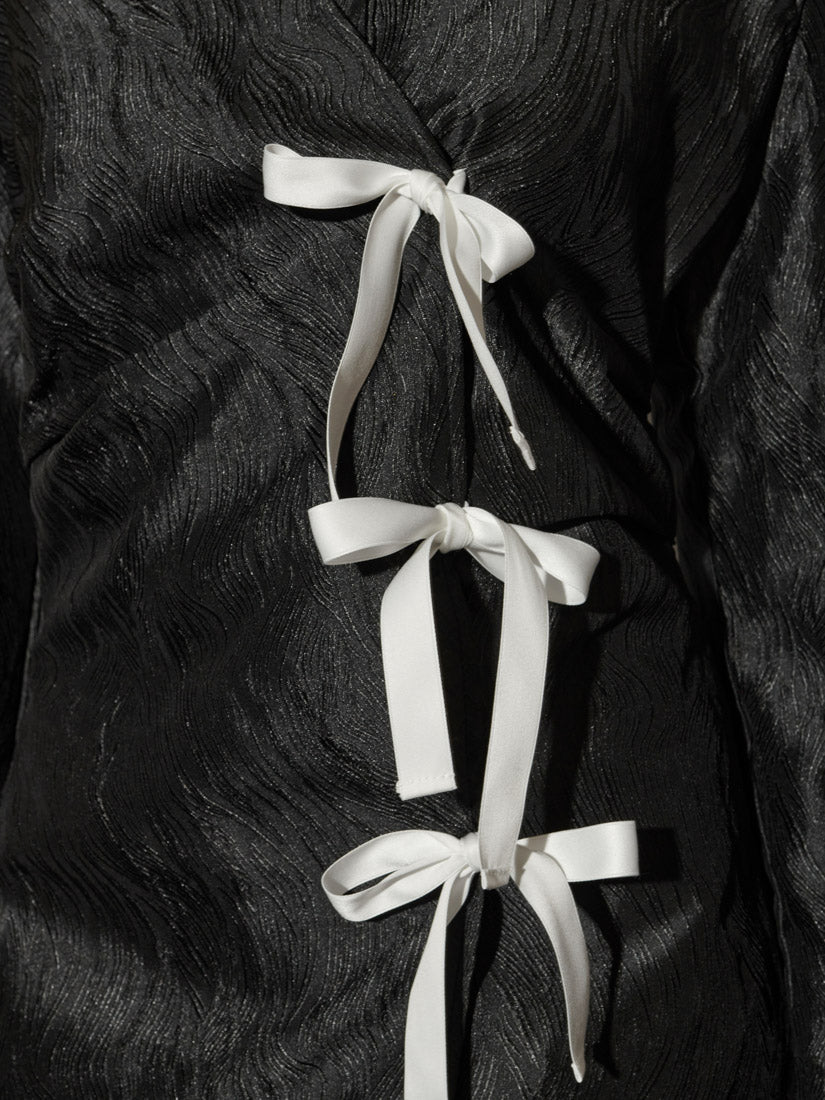 The Julie Wrap Mini brings old school tailoring into the night. Textured jacquard, contrast ties, and a statement collar for when you want to be power dressing.