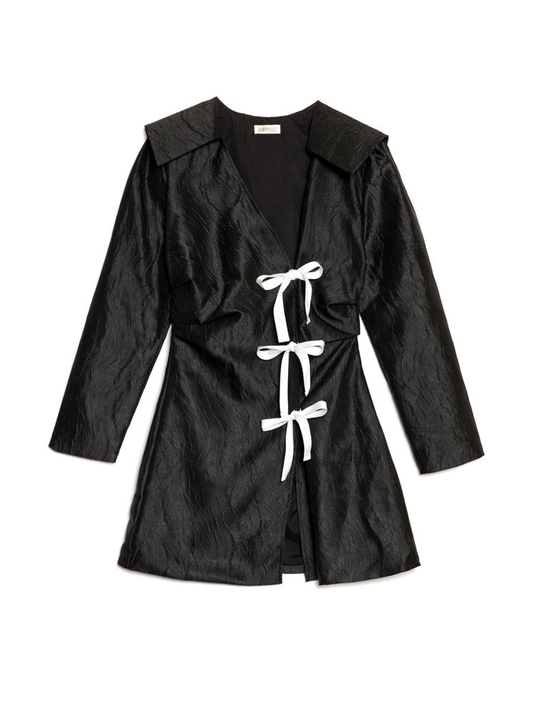 Mini dress in a textured jacquard fabric. A wrap style fastened with contrast ties. Featuring waist pleats and a statement collar. Fully lined.