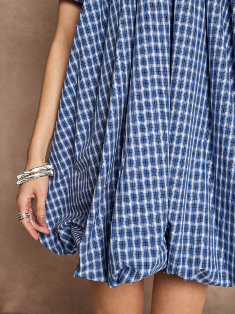 The Marissa Mini feels playful but cool, balancing an oversized bubble shape with a minimal check pattern. Its scooped, gathered back adds an element of surprise, effortless, airy, and subtly dramatic. It’s a piece that carries the spirit of a spontaneous escape from routine.