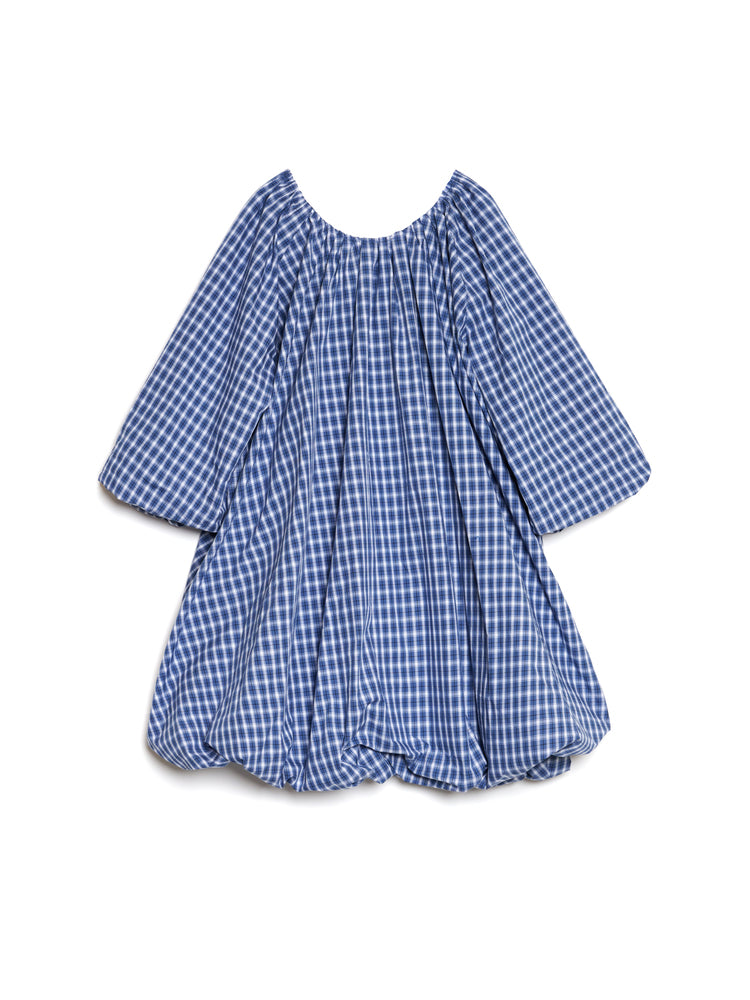 Mini dress in a cotton feel check fabric. An oversized fit with a bubble hem finish. Featuring a gathered scooped back neckline and tie fastening. The length of the dress is 86-90 cm depending on the size.