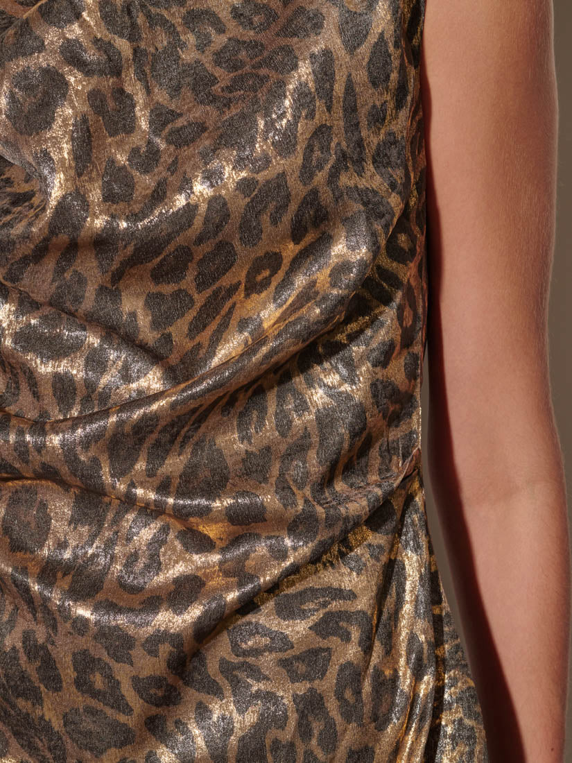 Mini dress in a drapey leopard fabric. A draped style featuring a cowl neck and waist ruching. Fully lined. The length of the dress is 83-87 cm depending on the size.