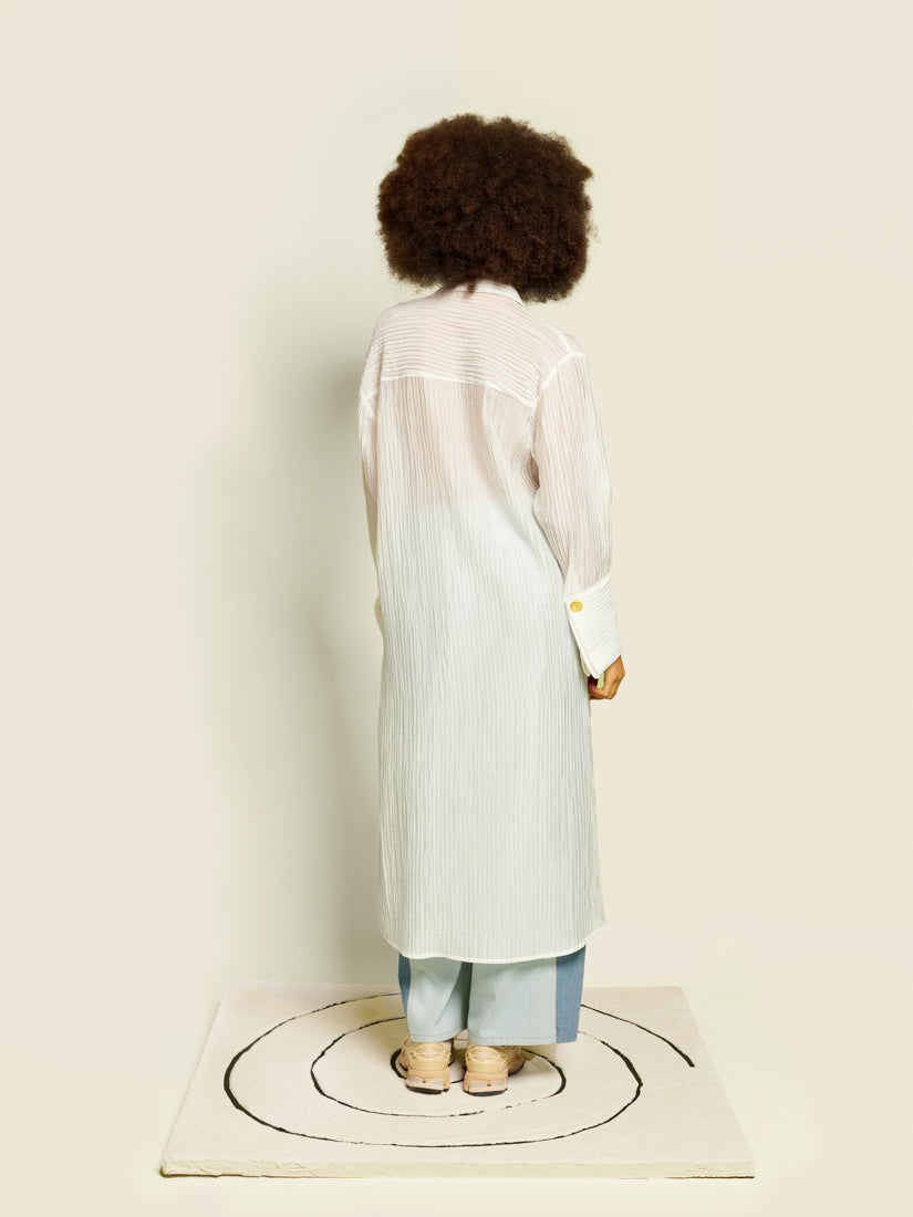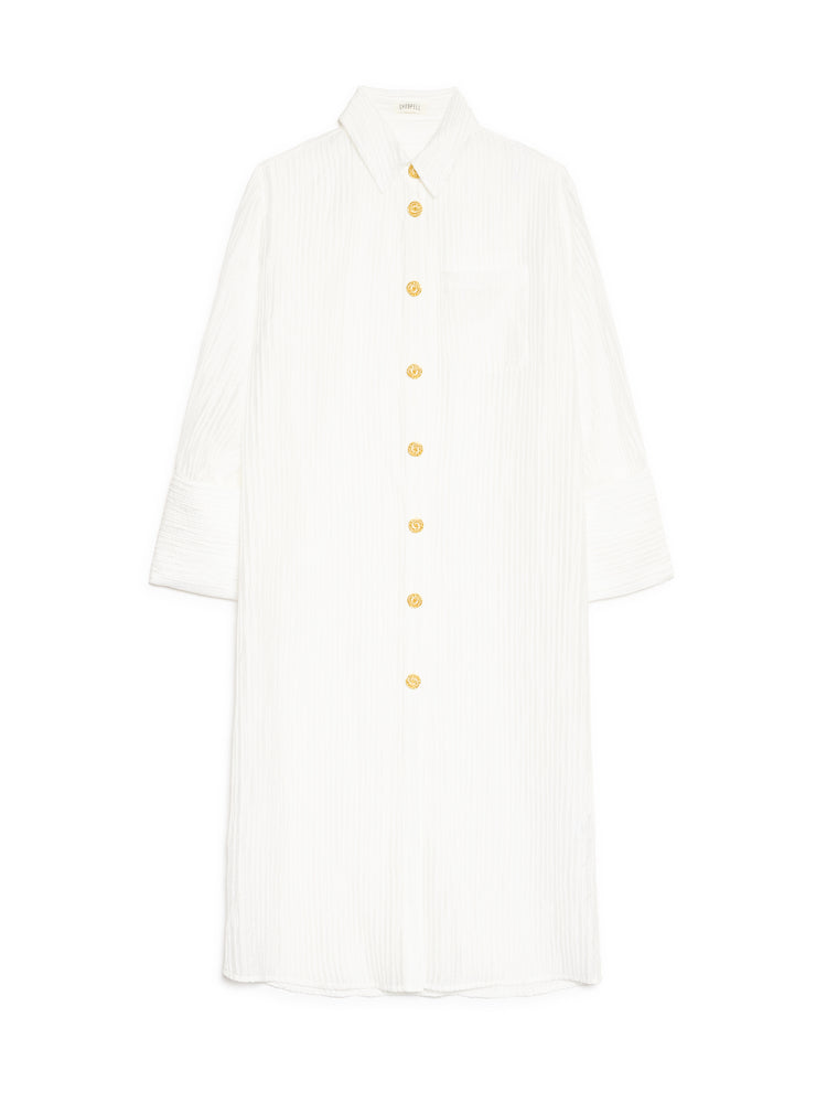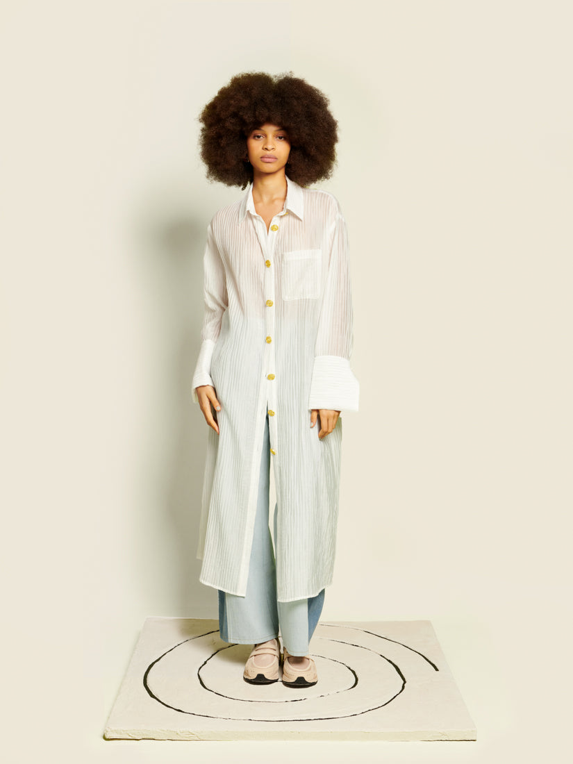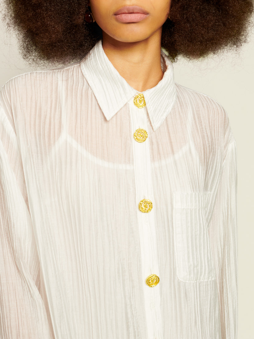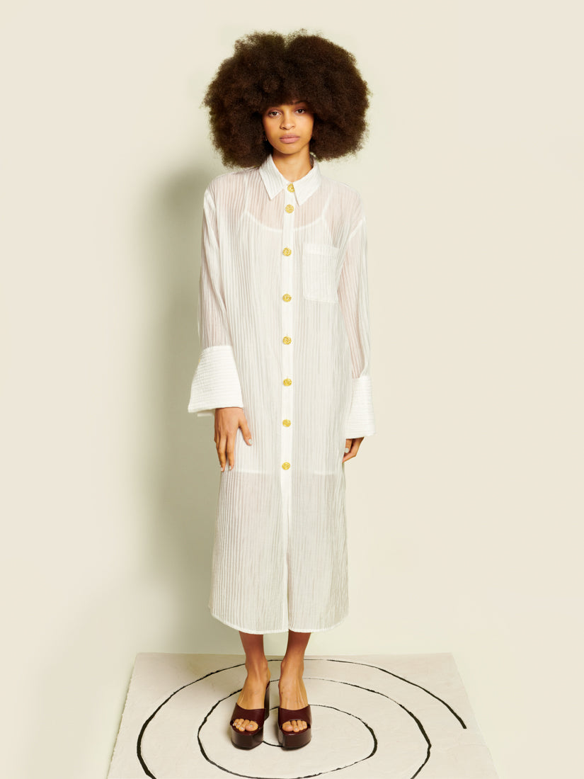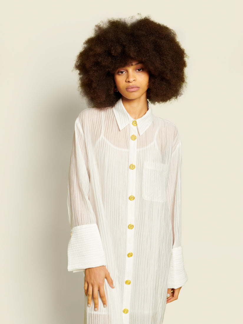 Sheer texture meets statement detailing in the Silvia Midi Dress, where gold spiral buttons punctuate a fluid shirt-dress silhouette. Light layers and oversized cuffs create a sense of drama without weight.