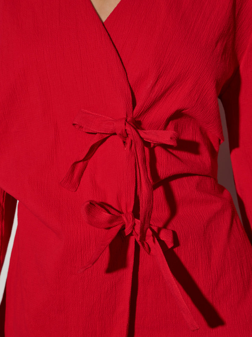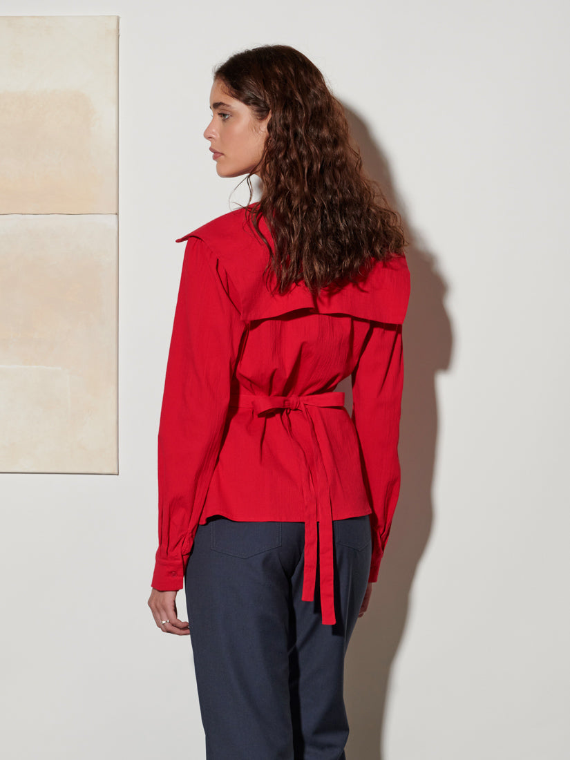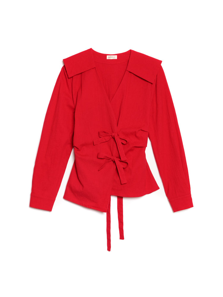 Top in a soft textured fabric. A wrap style fastened with ties, featuring side pleats and a back waist tie. Detailed with a statement collar.