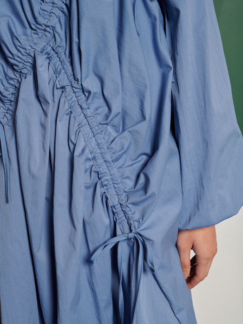 Oversized mini dress in a woven fabric. An asymmetric style featuring adjustable ruching channels with ties. Fastened with a cover button. The length of the dress is 96.5-100.5 cm depending on the size.