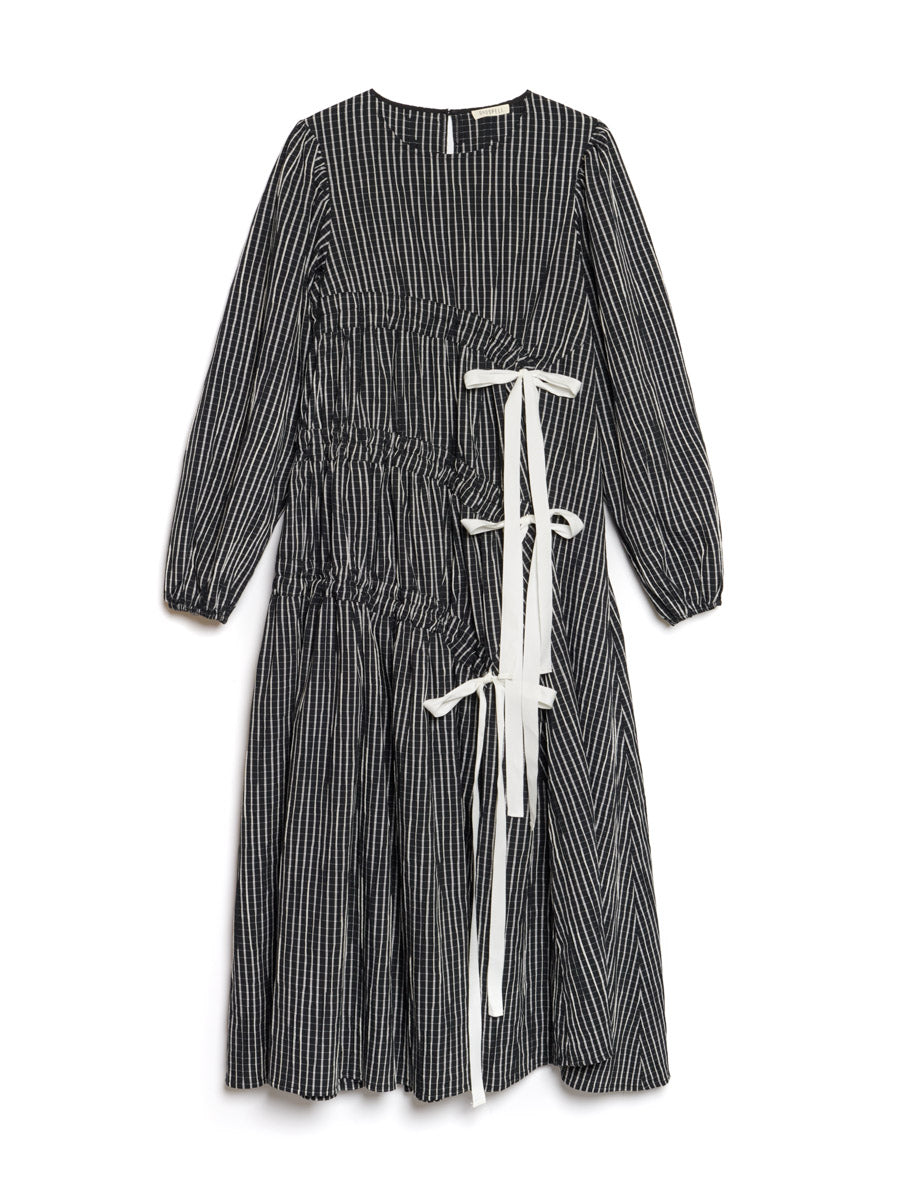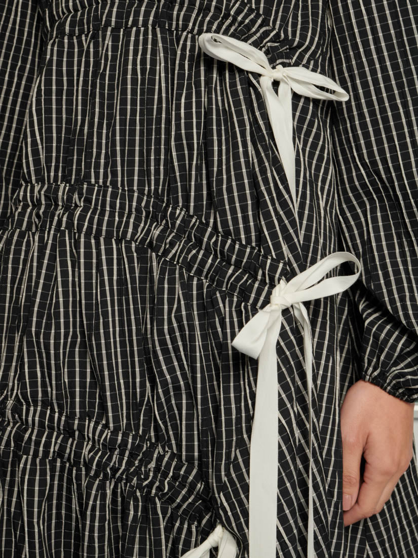 Asymmetric midi dress in a textured check fabric. An oversized fit detailed with a tiered ruched skirt with adjustable contrast ties. The length of the dress is 126-130 cm depending on the size.